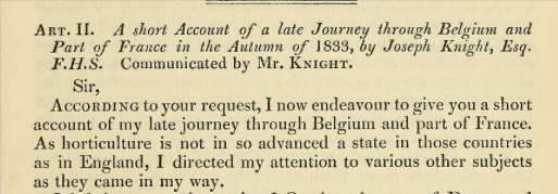 In 1834, Loudon’s Gardeners Magazine carried a 5 page report of Knight’s tourof northern France and Belgium where he comments on the agriculture and horticulture he encountered, as well as short accounts of the major gardens. Loudon notes that Knight “makes an annual continental tour” and comments “we wish all nurserymen and gardeners who travel on the continent to give us a similar account of it… there is a great want of spirit among the young nurseryman about London. They think they have done a great deal if they have ventured as far as Paris; but we are sure, but if they were to travel through Germany, and even into Italy, they would greatly enlarge their minds, acquire much more professional information than they have any idea of; and, what they will, perhaps, like best of all, extend their commercial connections.” The full account can read at: