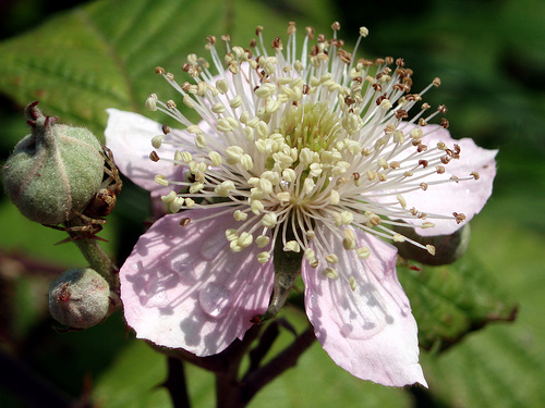 Wild blackberries are relatives of the rose. Like their close relative the raspberry, they are “aggregate fruit” since each berry is really a cluster of tiny fruits, or druplets, each of which contains a seed. There are over 300 wild species in Europe alone, and they hybridize easily, but in Europe most of the deliberately cultivated varieties derive from one of two species. One is Rubus tomentosus which has vigorous upright stems, covered with barbed thorns. It has white or pale pink flowers and round fruit. The other is Rubus ulmifolius which has leaves that have a soft felted underside, thorns on the angles of its stems, pink flowers, and egg shaped fruit.