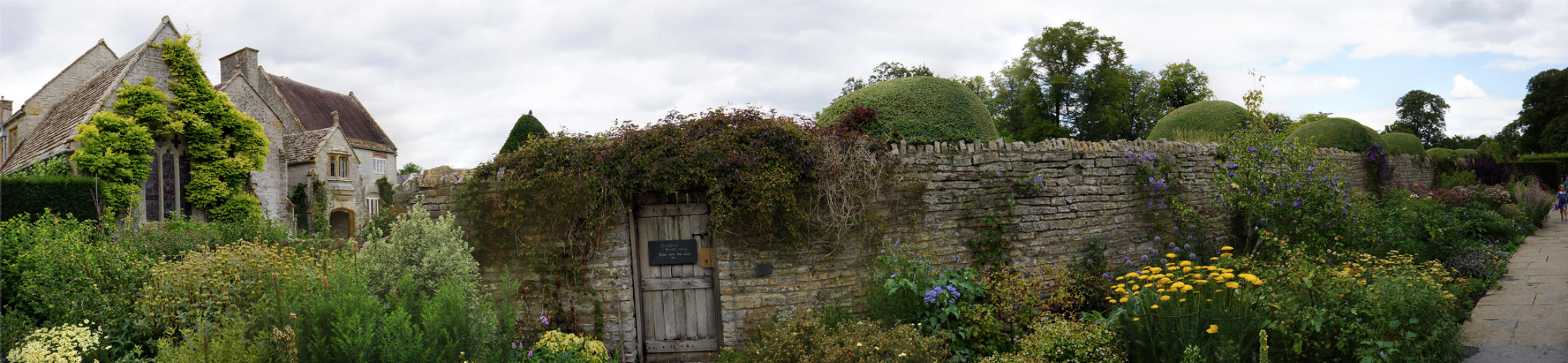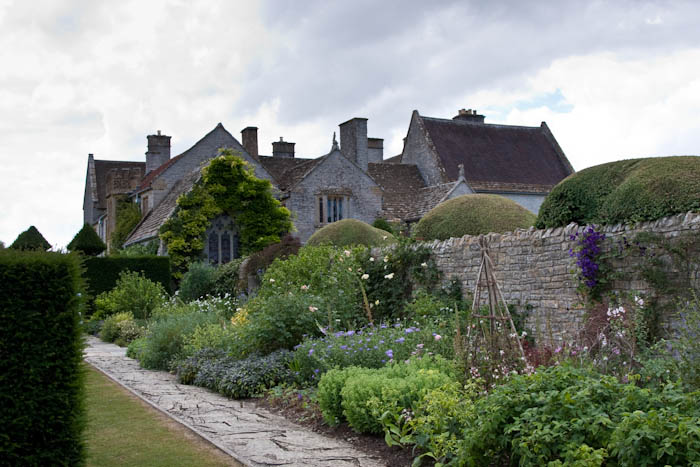 The front door of the house opens on to a very simple but effective formal approach. The Apostle Garden contains twelve yews planted by the Jenners to line the stone path that crosses the lawn, with a view to what appears to be a circular dovecot [as at Avebury] but which is in fact a water tower. Another set of yews line the wall separating this from the rest of the gardens.