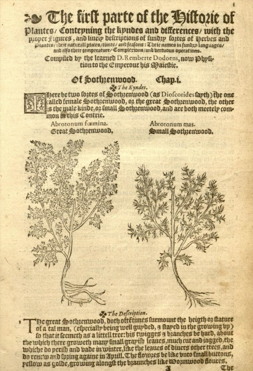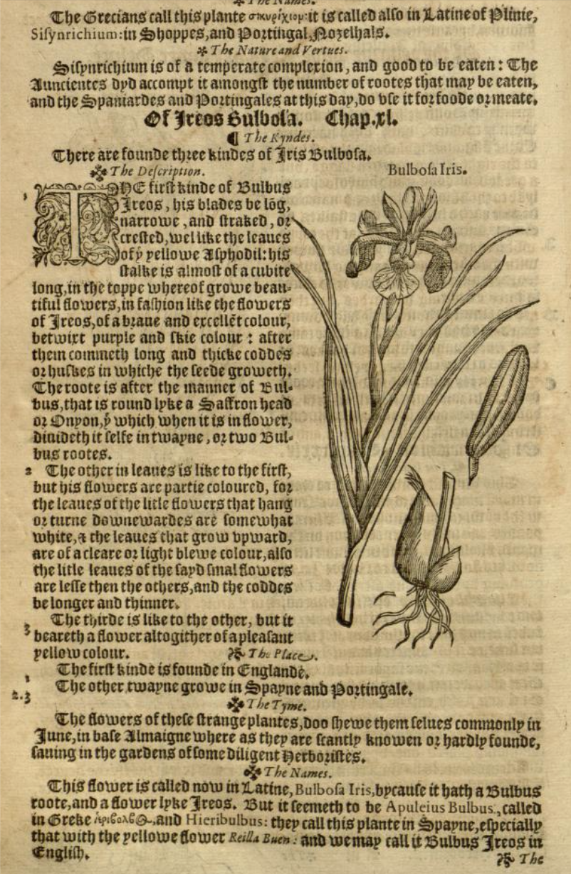 Lyte’s first and most important work was his translation of the Cruydeboeck, or herbal, of Rembert Dodoens, originally published in Antwerp, 1554. Dodoens book had been translated into French by Charles L’Ecluse, better known as Clusius, in 1557, and it was Clusius’s version that Lyte used as the basis of his own work. In the days when copyright was unknown and what we would call plagiarism was the norm, Lyte was very honest, and careful to distinguish the original text from his own comments and additions by getting the printer to use a different typeface.