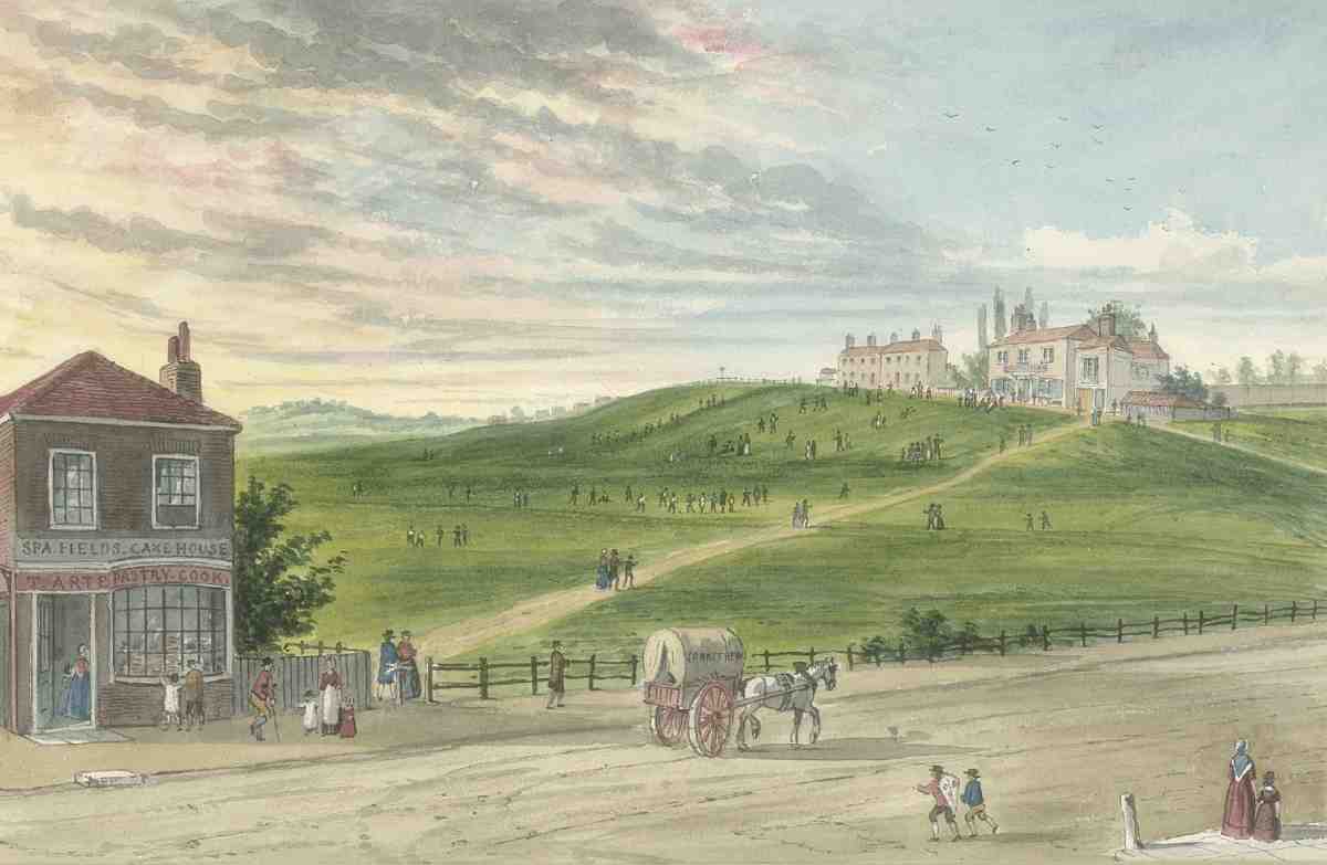 Spa Fields in the 1790s: looking east from Bagnigge Wells Road to Merlin’s Cave at the top of the hill, Charles Matthews, 1857