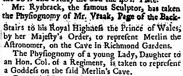The figures were taken from life, and news of who the models were appeared bit by bit in the papers over the course of the summer, as one by one they were called by Rysbrack to his studio where instead of his normal marble he sculpted in wax.