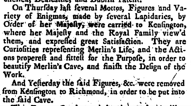 Read on to find out more about this early 18thc press release , just one of many snippets of news that appeared in contemporary newspapers and magazines about Queen Caroline’s strangest garden building: Merlin’s Cave.
