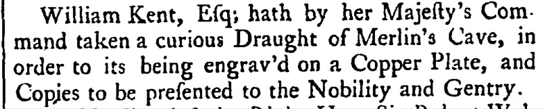 And Merlin’s Cave was clearly being promoted. Not only was Kent instructed to prepare an engraving to circulate to the court but the queen allowed the public in to the gardens see it as well.