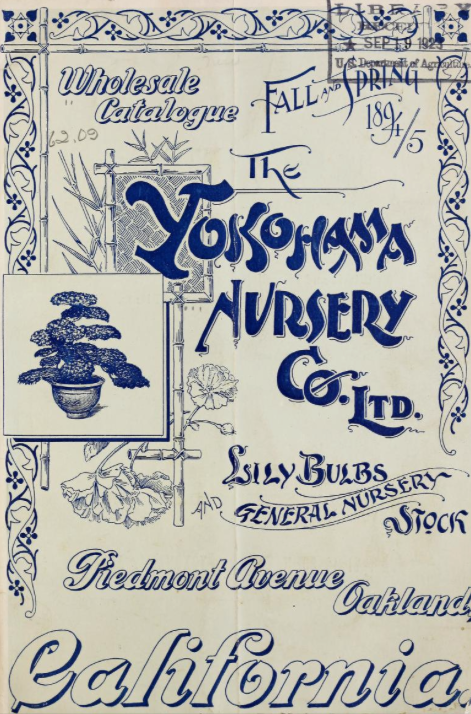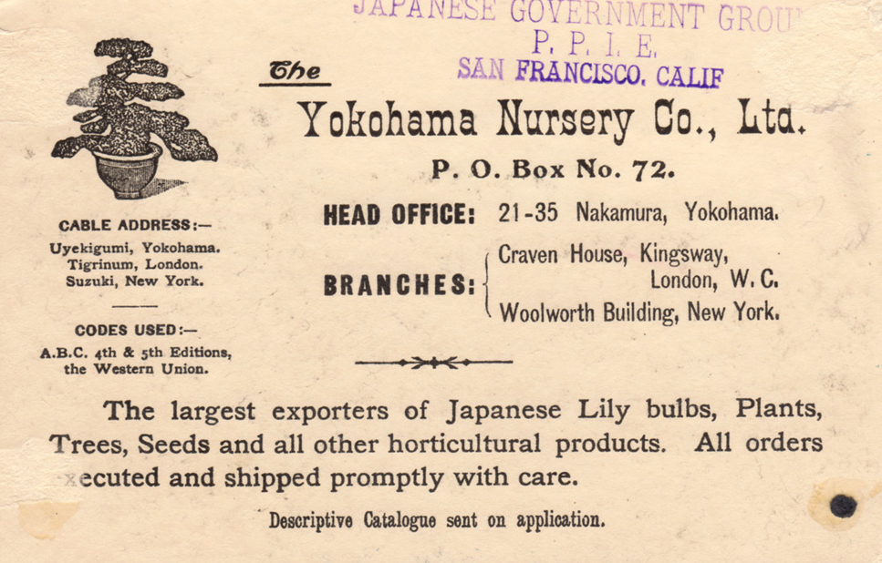 At the same time one of Boehmer’s Japanese staff, Uhei Suzuki left and set up another nursery in competition. Amongst his first acts was the opening of an office and ‘holding’ nursery at Oakland in California. Very shortly afterwards he joined forces with three other Japanese nurserymen to form a cooperative, the Yokohama Gardeners Association.