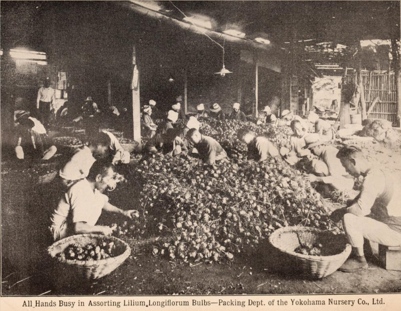 “The packing sheds presented a beautiful and animated scene, peopled by a hundred or more women dressed in bright blue kimonos with figured blue-and-white handkerchiefs about their heads and white socks and wooden sandals on their feet. Fern balls were then a fad in America; half a million were shipped from Japan to New York and London annually, and these blue-clad women were busy making them. The men were dressed in rather elaborate blue jackets. On the back of each was an enormous white circle in which was stenciled the company’s name in Japanese characters….“It seemed incredible,” he wrote, “that a nursery could be so picturesque.”