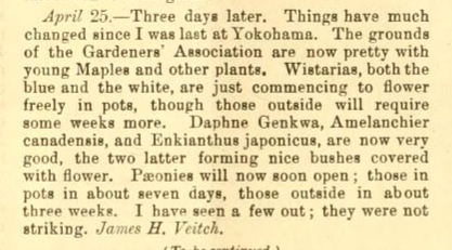 One of their earliest business deals was with James Herbert Veitch, of the pioneering Exeter nursery family, who had travelled in Japan in 1892. He did not think much of Yokohama itself: “the fine temples and general objects of interest for which Japanese towns are famous are here… entirely absent.” But he visited the city’s plant nurseries, most of which were small-scale and offering mainly trained or potted plants. It is clear from his article in Gardeners Chronicle that the new Association’s nursery was more impressive, even if “the deciduous plants… were only so many sticks at present”.