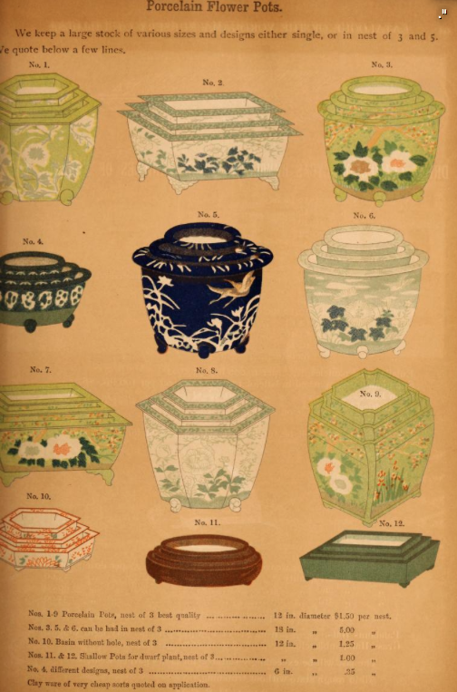 Alongside the plants they offered bulbs, seeds and even a wide range of decorative porcelain flower pots and other decorative objects for the garden and greenhouse.