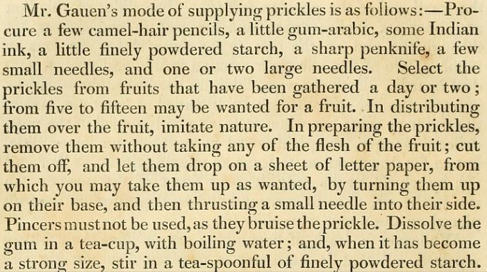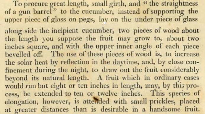 Now you’ll remember I’m sure one of the downsides of Gauen’s method of ‘elongation’ of cucumbers was that they would have “small prickles placed at greater distances than is desirable in a handsome fruit”. [If he was worried about that what on earth would the poor man have made of the bags of misshapen veg now beginning to re-appear back on supermarkets shelves?] To ensure complete perfection and have a collection of cucumbers of equally spaced and beautiful prickles then you just need to follow his instructions…