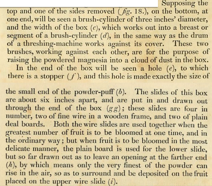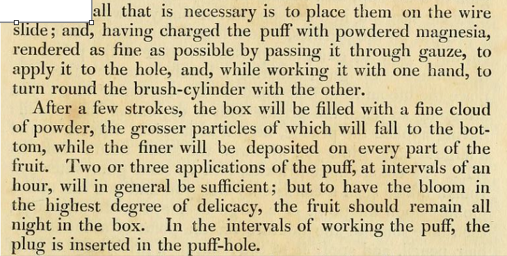 Of course “in the performance of this operation, the bloom will have been injured,” but guess what …with another little bit of labour-intensive ingenuity Mr Gauen will help you restore it. To do so you need “a box with slides (fig.18.a), a common powder-puff (B), and a few ounces of finely calcined and perfectly dry magnesia.” And before you ask “the box may be of any size, according to the quantity of fruit which it is proposed to subject to the blooming process at any one time.” However, the one that he and his publisher would be selling with his treatise would be “about 20 inches long, 18 inches deep, and 13 inches wide.”