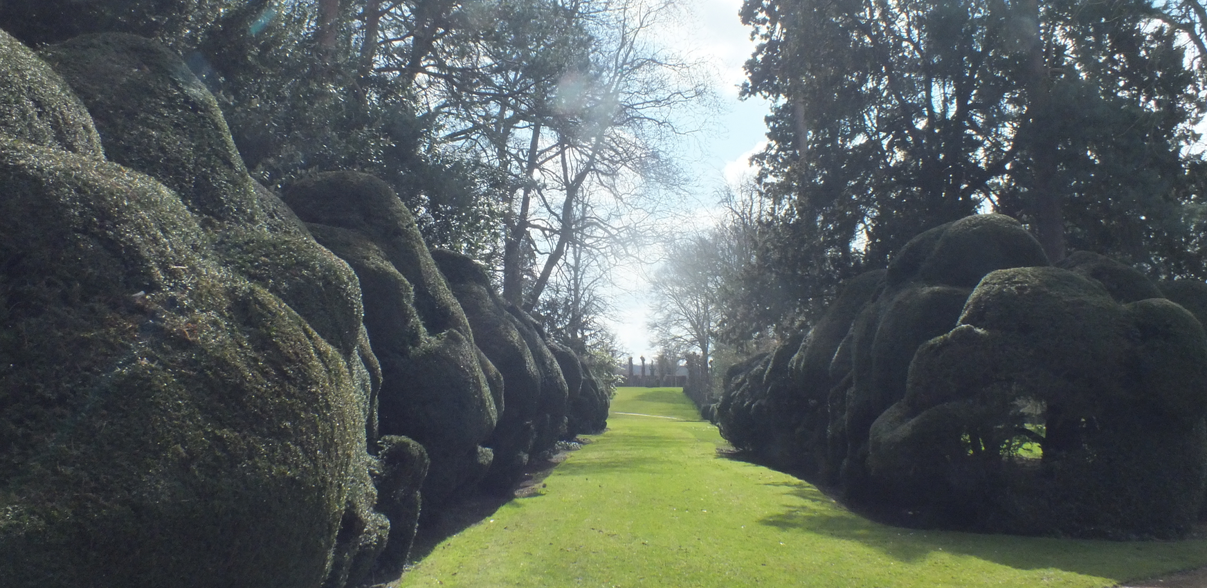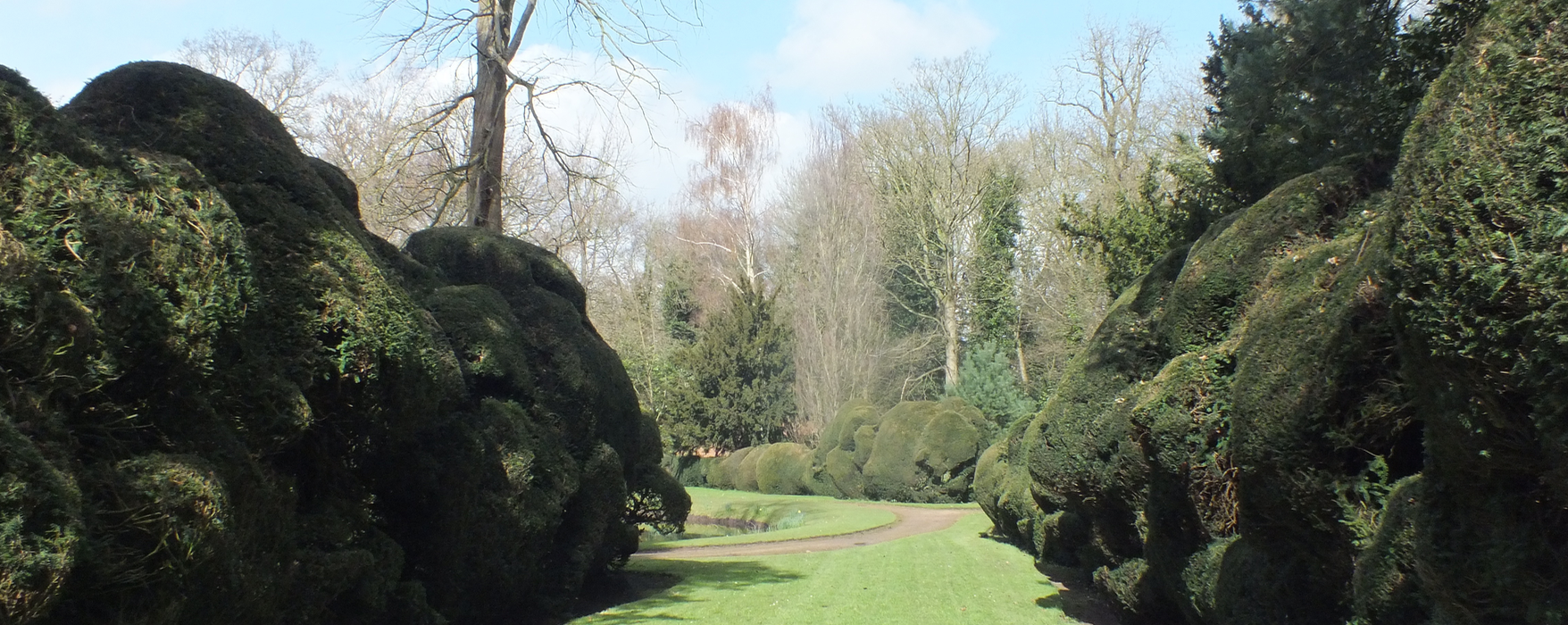 As can be seen from the full plan of the garden, from the Birdcage a wide grass path, that cannot be seen from the house or the garden in front of it, runs southwards between more overblown yew hedging. As the visitor turns onto it the entire feeling of the space changes from openness and light to enclosed,cool and shady. The path crosses the end of the Yew Walk and then widens before rising up a long slope and away into the distance.