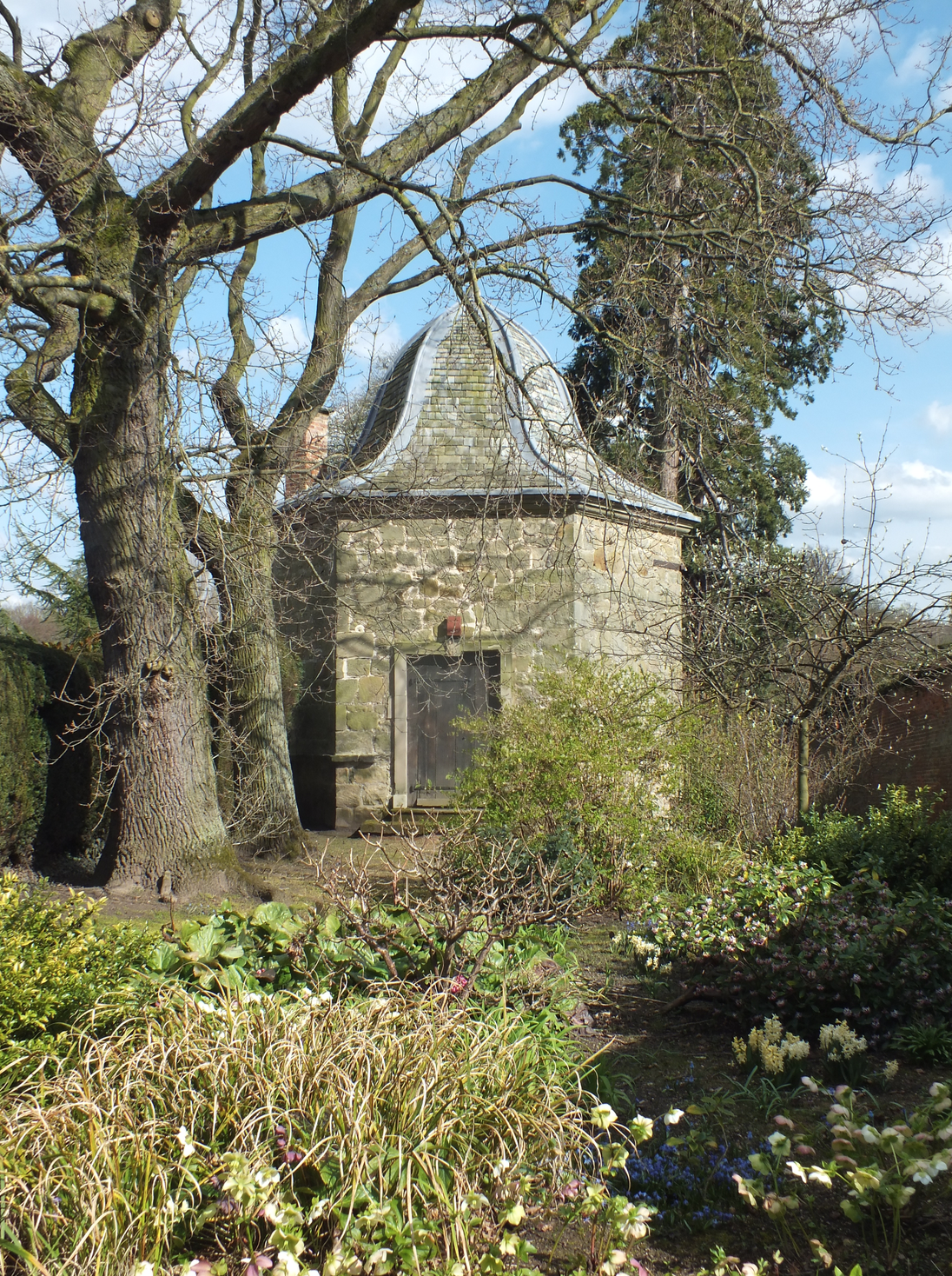 Further garden work was carried out in 1708 when the hexagonal dovecot from the earlier garden was remodelled and given its current attractive roof, as part of its conversion into the estate’s Muniment Room. This is marked C on the plan above, and stands just inside what is now the public entrance to the gardens from the service courtyard [marked A] opposite the church. There is a small modern garden area tucked in behind it and some other service buildings.