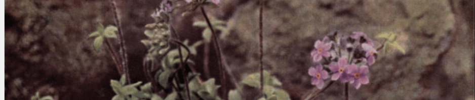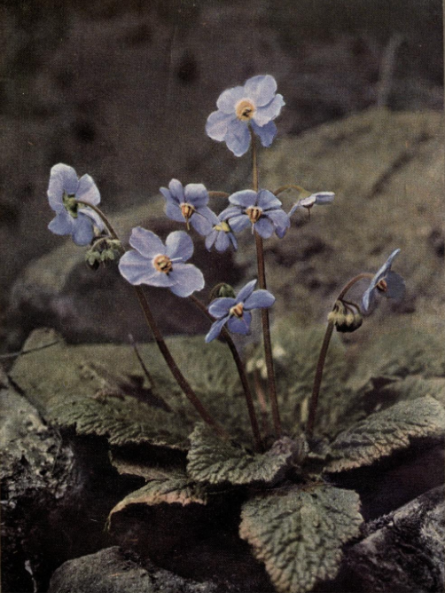“For cool crevices facing North (Ramondia pyrenaica)”, from Rock Gardening for Amateurs, https://archive.org/details/rockgardeningfor00thomrich