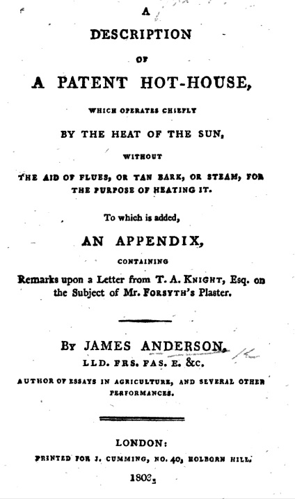In 1799 for example Dr James Anderson in his [sadly unillustrated] Recreations in Agriculture wrote of how more of the heat from the sun could be used to prevent “an immense source of waste of that benign element”. He argued that “all that is necessary is to confine the air that is once heated by the sun, and so to distributed as to make it produce a genial influence through every part of the house, while we still retain the power of regulating it at pleasure.” Although Anderson was talking mainly about maximising the efficiency of the sun’s heat on hot-walls and in hot-houses the principle was the same in Gauen’s contrivance, and indeed for much of Loudon’s own work on improving the construction of greenhouses [for more on Loudon & greenhouses see post ] Anderson then went on to write an entire book on the subject: A Description of a Patent Hot-House which operates chiefly by the heat of the sun, in 1803. Anderson’s books can be found at :