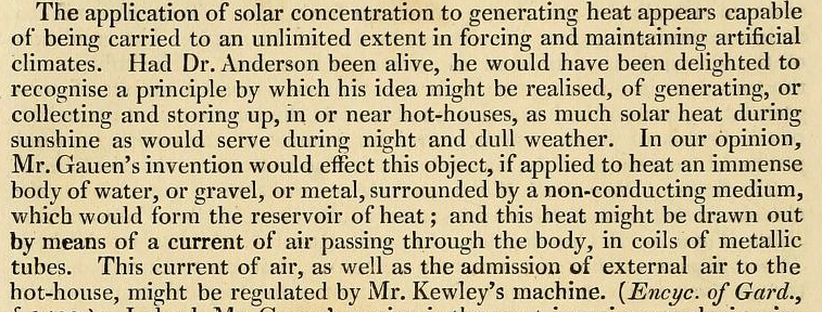 Loudon concludes that the only question concerns ” the expense of the concentrators, and the machinery requisite to keep them continually at the proper angle to the sun’s rays. We wish some person of leisure, ingenuity, and a little spare money, would communicate with Mr Gauen on this subject.”