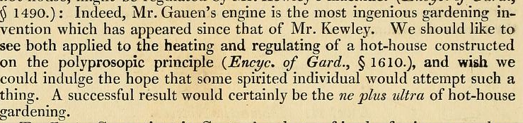 Loudon was, as always, nothing less than ambitious since he “could see no difficulty the thing but the expense” and so ” it would be an easy matter, not only to heat hothouses, but to raise the temperature of an entire garden, or even an entire country”