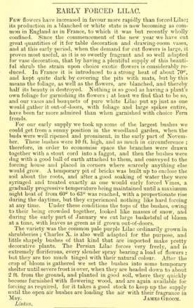 Surprisingly the fashion for forced “white lilac” didn’t seem to catch on in Britain for quite a while. William Robinson in his Guide to Paris gardens of 1869 remarked that English visitors got quite a surprise when they saw “large bunches of it in every little flower shop” in January and noted that it was always associated with the early violet and the forced rose. But it wasn’t long before it did because he published several articles about it in The Garden.