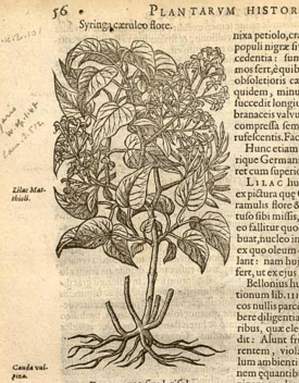 Syringa vulgaris L. [as Syringa caeruleo flore] from Clusius’s , Rariorum plantarum historia, vol. 1: fasicle 1, p. 56, fig. 1 (1601)