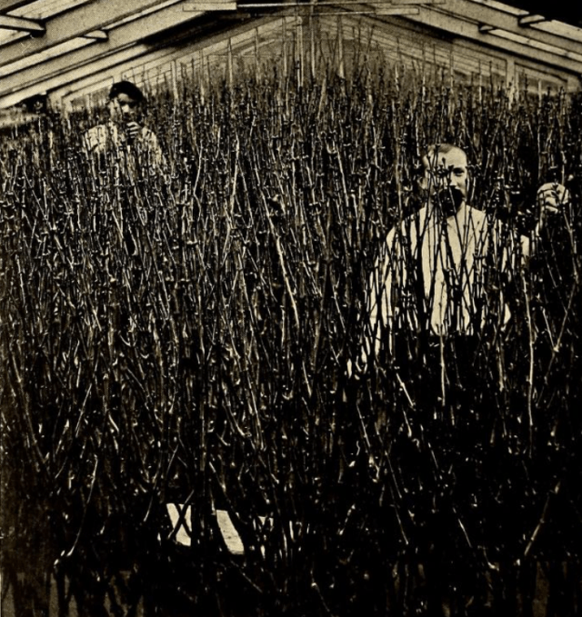 When winter arrived the rods were lined out in narrow rows in rich soil inside the shed. The doors and windows were sealed and the heat turned on.