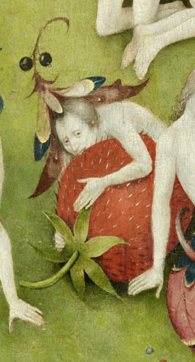 But the strawberry didn’t just appeal to the Virgin Mary and the saints. There is an alternative interpretation – where strawberries are seen as sensuous and erotic – so even if they don’t have sex they help others to! This is particularly apparent in the “Garden of Delights,”by Hieronymous Bosch (1455-1516). It’s a complicated picture capable of all sorts of interpretations which sadly we don’t have time to go into – but there’s not much doubt that the people in and around strawberries are not just praying!