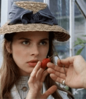 This more earthy association lives on: think of Hardy’s Tess of the Durbervilles being seduced by strawberries : He asked her if she liked strawberries ‘Yes’, said Tess, ‘when they come.’ ‘They are already here.’ D’Urberville began gathering specimens of the fruit for her, handing them back to her as he stooped; and, presently, selecting a specially fine product of the ‘British Queen’ variety, he stood up and held it by the stem to her mouth. ‘No—no!’ she said quickly, putting her fingers between his hand and her lips. ‘I would rather take it in my own hand.’ ‘Nonsense!’ he insisted; and in a slight distress she parted her lips and took it in.