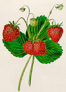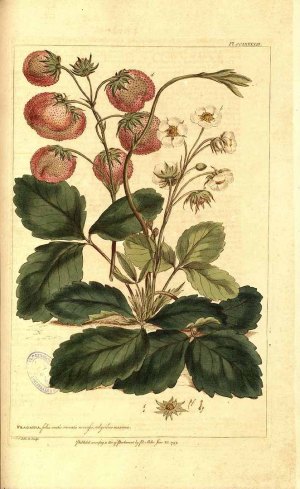 Although Duchesne led the world scientifically it was English nurserymen rather than French who took over in matters practical, especially when it came to raise new hybrids. In the late 18thc and early 19thc, new seed-raised derivatives of F. virginiana—the Scarlet strawberry—were introduced so that by 1824 James Barnet, under-gardener for the Royal Horticultural Society, could name twenty-six varieties. He also listed 3 varieties of the Chilean species but said they did not do well in Britain. William Cobbett scathingly commented: “As to the Chili it is very little superior in flavor to the potato.” However it was found to be a suitable parent when hybridizing.