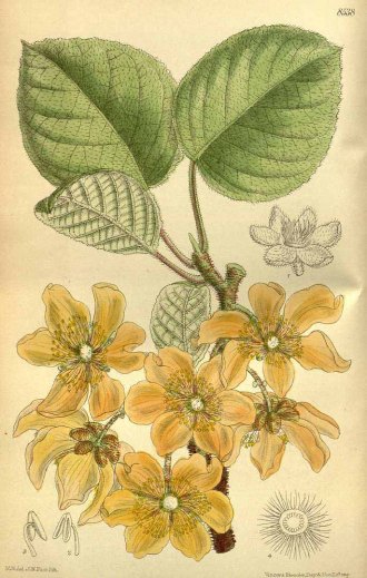 This was Ernest Henry Wilson, who was in China, like Maries, plant hunting for the Veitch nursery. In particular he was searching for Davidia involucrata, the handkerchief tree, but whilst doing so, amongst other things, he found a ‘new’ form of actinidia. [Hortus Veitchii p94]. Some seeds were sent back to Veitch’s nursery, and finally actinidia began to enter cultivation. It was written up in the RHS Journal in 1903, and also got a passing mention in Gardeners Chronicle in 1904, but in neither case with any sense of excitement. It doesn’t reach Curtis’s Botanical Magazine until 1914.
