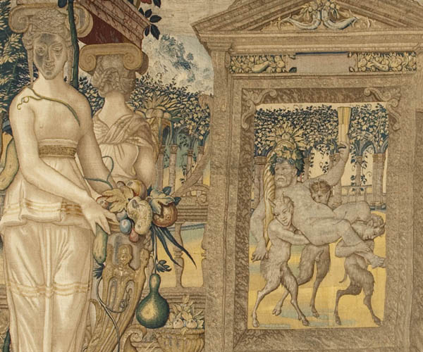 detail from a tapestry showing the satyrs outside Pomona’s orchard , designed by Circle of Pieter Coeck van Aelst & manufactured by Wilhelm Pannemaker, Brussels, ca. 1545-1550, Royal Palace, Madrid