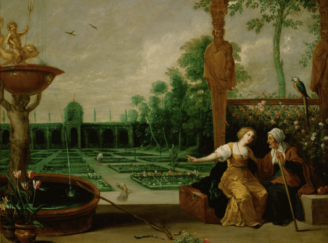 Vertumnus and Pomona in a Garden, with Juno’s Peacock, Dirck van den Bergen, Ham House, National Trust
