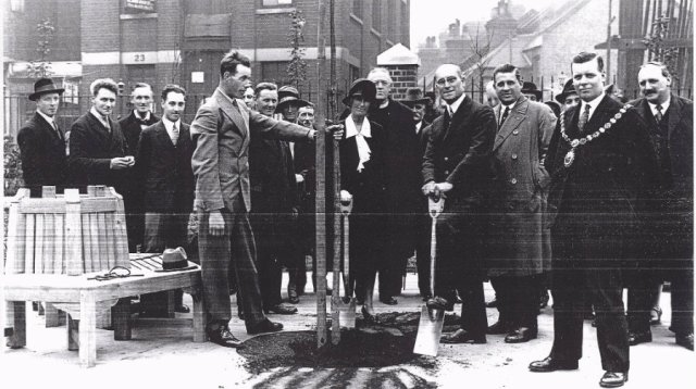 Ada planting a Tree of Heaven at the opening of the Tanner Street playground, May 1929, image from Lebas, “Making of a Socialist Arcadia, Garden History” 1999
