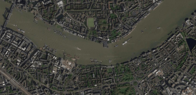 The southern bank of the Thames from Tower Bridge towards Rotherhithe. The manor house ruins are in the small green square on the riverbank just to the right of centre.