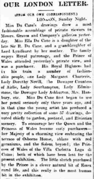 Ella Du Cane’s first formal exhibition was at Graves Gallery in Pall Mall where she showed 57 watercolours. It was visited by the Prince of Wales and other members of the royal family, who also bought some of the pictures. A report of the exhibition says “she first began to use her pencil seriously only three years ago.”