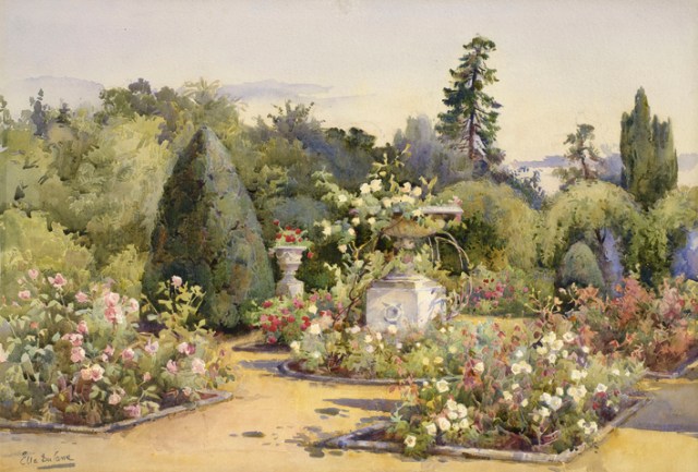 Ella taught herself paint but she had little by way of formal artistic training, apart from a few informal lessons from family friend Sir James Linton. This connection maybe how she managed to have a picture accepted in 1893 at an exhibition of the Society of Painters in Water Colours of which Linton was a leading member. The same year she was presented at court. This was a significant step for her art as well as socially. There are newspaper reports of other paintings of hers being shown in amateur or society charity fundraising shows, including one from 1896 about her sketching the gardens of Windsor, Frogmore and Osborne for Queen Victoria. The queen must have become a became a big fan of Ella and her work since she bought 26 paintings between then and 1898. Some of these were used as gifts, 4 entered the official Royal Collection while others are thought to be in the ‘private’ collections at Windsor, Balmoral or Sandringham.