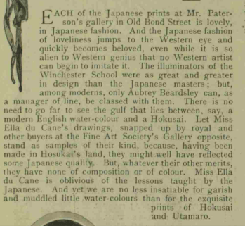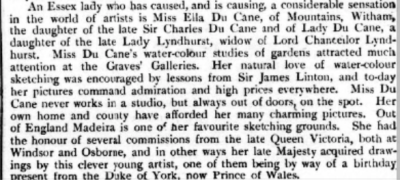 On their return Ella exhibited nearly 100 paintings in 1908 at the Fine Art Gallery, most of which were sold during the private viewing, including several of which were bought by Edward VII. However not all the critics were favourable as can be seen from the tart comments from Illustrated London News.