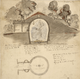 The lawn which descended from the terrace also had impressive new introductions including an 10 ft high araucaria [or monkey puzzle, only commercially introduced in the early 1830s] and a 20ft deodar. Apart from the usual trappings of assorted flower gardens, ponds, bowling green and garden buildings there was “a deep dell arched with massive rockwork formed into caverns and planted with arbutus and other evergreen shrubs”. A Gothic summer-house commanded “a prospect of the hills of Harrow and Highgate and St Paul’s Cathedral”. Beyond the formal garden areas was a pasture field surrounded by a walk lined with trees on one side, and shrubs and flowers on the other which gave a circuit of about a mile from the house.