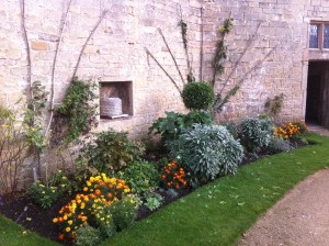 The Fountain Garden is simple in design and form. Archaeological survey and excavation during the 1990s revealed the detail of the 17thc path layout but no traces of beds were found. However in the reconstruction of the garden narrow beds have been created at the base of the wall, while the central area is lawn.