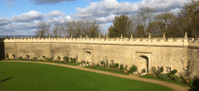 The fourth garden area – the Fountain Garden – brings to mind a medieval Hortus Conclusus, and occupies the rebuilt castle’s inner bailey. It was originally surrounded by the high walls of the mediaeval castle, but topped by a crenellated ‘High Walke’. A bridge was constructed about 1633 to join it to the Terrace Range. The Fountain Garden area and its walls were badly damaged during the Civil War and not repaired until William Cavendish returned after the Restoration. He moved its entry point from the Great Court creating a grand rusticated doorway.