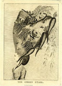 The Green Stall, 1777: another monstrous hairdo this time decorated with carrots, asparagus, a cabbage, turnips, lettuce and trails of pea pods imitating ribbons. Notice the set of scales with potatoes and the herbs instead of ostrich feathers