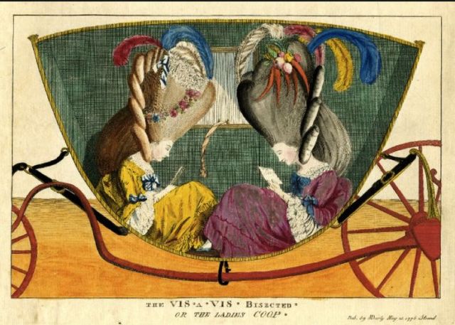 What is equally surprising is that although you’d expect the object of their satire to be upset or perhaps embarrassed, it seems exactly the opposite was often the case and there are press reports of people actually imitating the prints! The General Post for May 7-9, 1776 noted a woman attending a masked ball with “her head dressed agreeable to Darly’s caricature”, and in July another was at the spa gardens at Bagnigge Wells “with her hair dressed in the extreme of the modern taste, the enormity of the size exactly resembling that which some of the print shops exhibits …She was mobbed and had to flee the scene.” Morning Chronicle and London Advertiser, July 2, 1776).