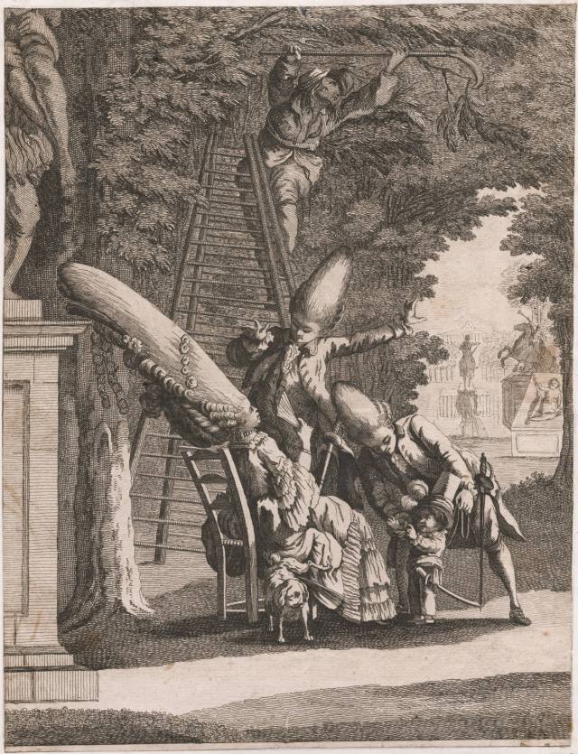 The inverted heart-shaped pyramid of hair was the height of fashion in 1776 when this print was issued, and ostrich feathers were newly in vogue too. Also rather surprisingly instead of showing women with Capability Brown landscapes atop they show rather old-fashioned formal garden.