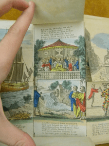 Such books were designed with what would now be called the interactive readers in mind. To read the complete story the reader has to participate. If they don’t the rest of the narrative stays hidden. For added encouragement these books often included instructions in the text to “Turn it up and you may view…” or “Turn down, you’ll find the ready way,” but in every case, as far as I can see, lifting the flap merely continued a fixed storyline and allowed for no other options.