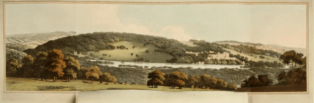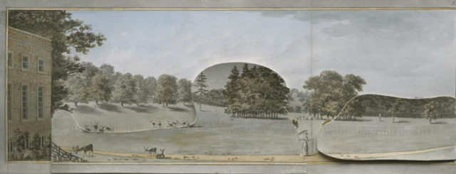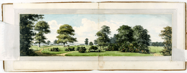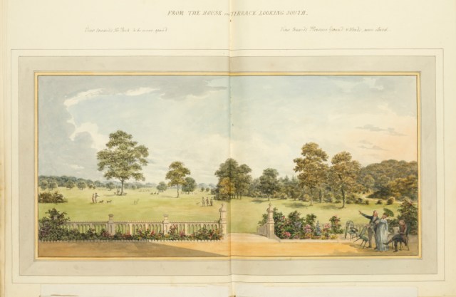 I looked a few weeks ago at the techniques that Repton used in his Red Books, particularly his trademark flap or overlay to show his proposed improvements. This week I want to turn to another aspect of the Red Books and his printed works which rarely attracts much comment… and that is only marginally to do with flaps and slides. It’s the way that Repton uses the double-page spread to show the full extent of a landscape. Is that significant? Why did he do it?