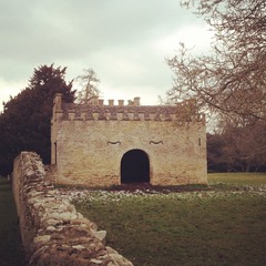 At Fort Putnam the cows were protected by massive battlemented sandstone walls that surrounded a courtyard, with an additional screen wall topped with balls or coronets. The various farm buildings are all inside, leaning against up against the walls and sadly the architecture isn’t as anywhere near as impressive as the walls themselves – but then maybe the cows, like the Duke, weren’t that fussy. The dairy is now available for holiday lets. [See Barbara Jones, Follies & Grottoes, 1974, pp.303-4; Country Life, 30 June 1983, pp.1796-1800]