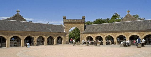 Adam’s farm design is highly original. Again built in local sandstones of various colours and in mock baronial style the whole complex resembles an angular ‘cartwheel’. There is a central courtyard formed by low buildings with open arched bays, linked at the corners by impressive entrance arches which only lack portcullises to make them mini-castle gatehouses.