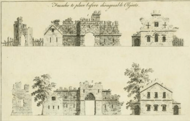 A series of grand facades “to place before disagreeable objects.” from Timothy Lightoler, The gentleman and farmer’s architect, 1762