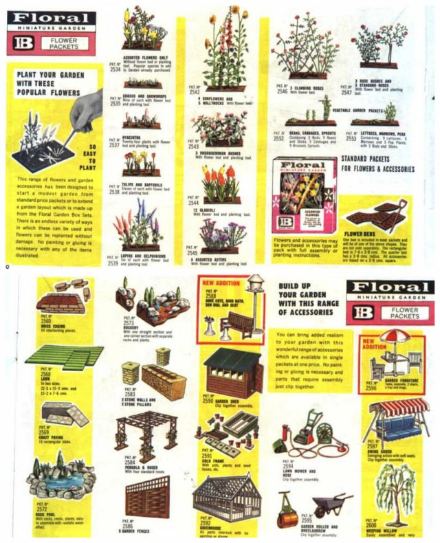“You can make an endless variety of Garden layouts with this wonderful series. These box sets show some of the arrangements you can assemble but with a simple system of “one price” packets of flowers and accessories you can extend your garden to any size. With no painting or gluing it has a unique appeal to girls as well as boys and can be of great assistance in domestic and professional planning. [Britains Catalogie 1966].
