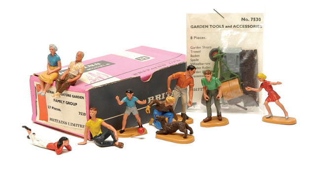 Britains – Floral Miniature Garden – Set 7530 – Family Group, comprising: Man with Spade, Lady with Trowel & Basket, Seated Grand Mother, Seated Grand Father, Boy with Football [mounted on base spigot] and Girl playing with Dog, Man with Shears, Prone Teenage Girl & Prone Teenage Boy listening to Transistor Radio, Garden Roller, Wheelbarrow & Garden Bench., Vectis Auctions
