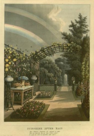 In another example of this sort of arrangement Repton illustrates his essay “Concerning Contrasts” with “a gaudy sketch..taken at the moment when a dark and heavy summer shower was suddenly succeeded by a bright effulgence of light in a conservatory from which the roof had been removed.”