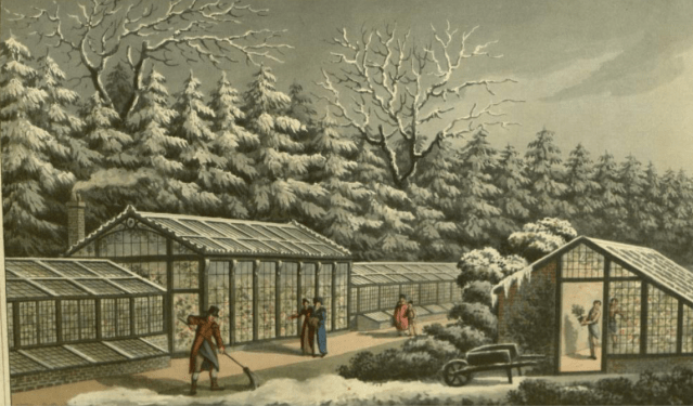 …not only did he consider such buildings ugly but to make matters worse if they were directly joined to the house they caused problems with damp and smells because of the “large body of earth in the beds or pots” and this odour could often be more powerful than the fragrance of the plants. A small lobby or ante-room between the two buildings was the absolute minimum.