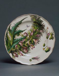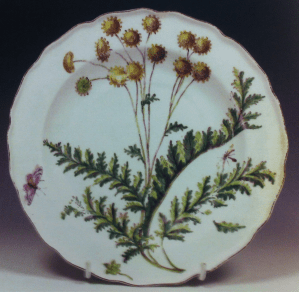 While the plants are generally extremely botanically accurate, there was some artistic licence over colours since white flowers would not stand out on white porcelain, and over some leaves and stems, where the overall aesthetics effect were more important than accuracy: after all these were for the dinner table not a botany book.